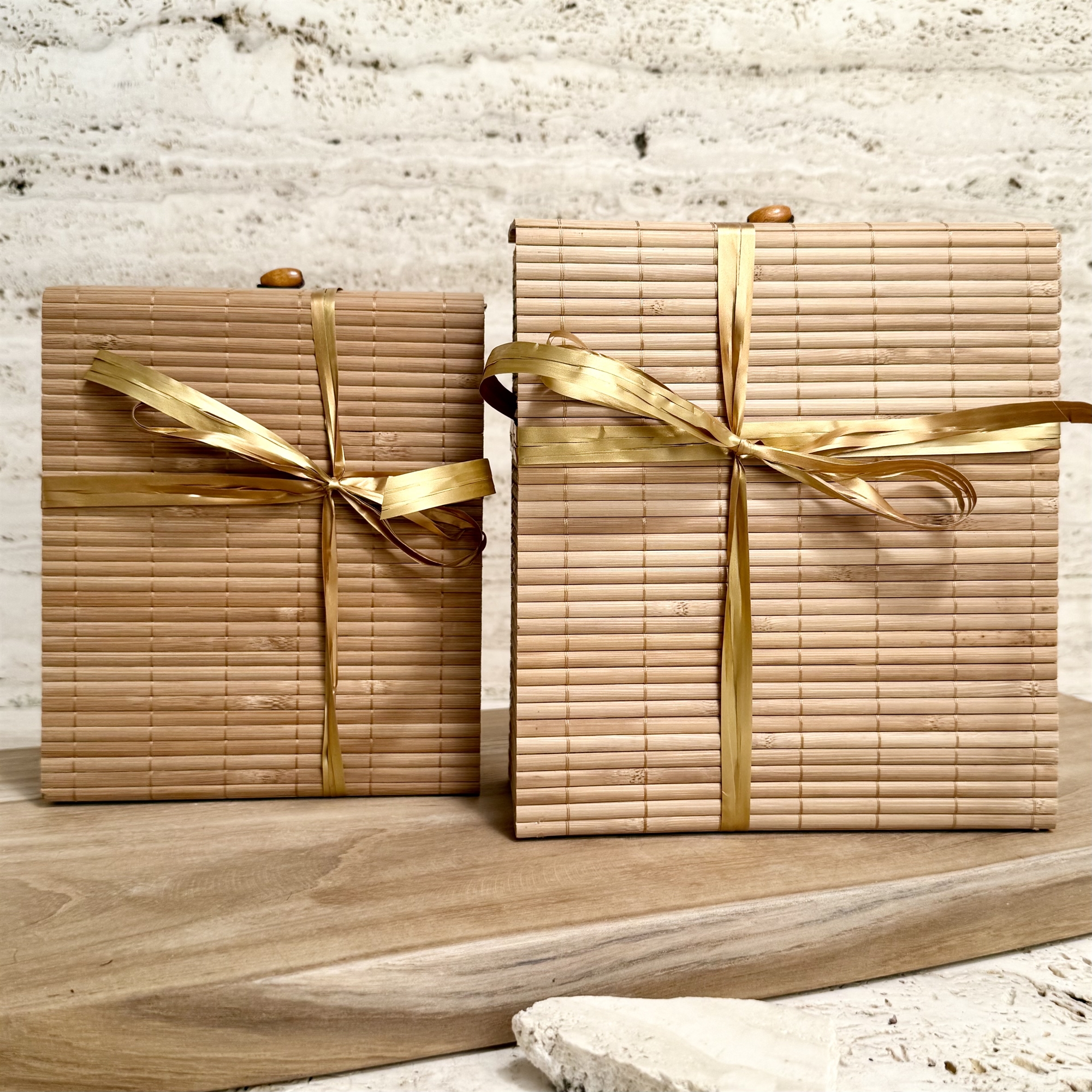 Pakket i smuk bambusæske og pyntet med nedbrydeligt papirsbånd