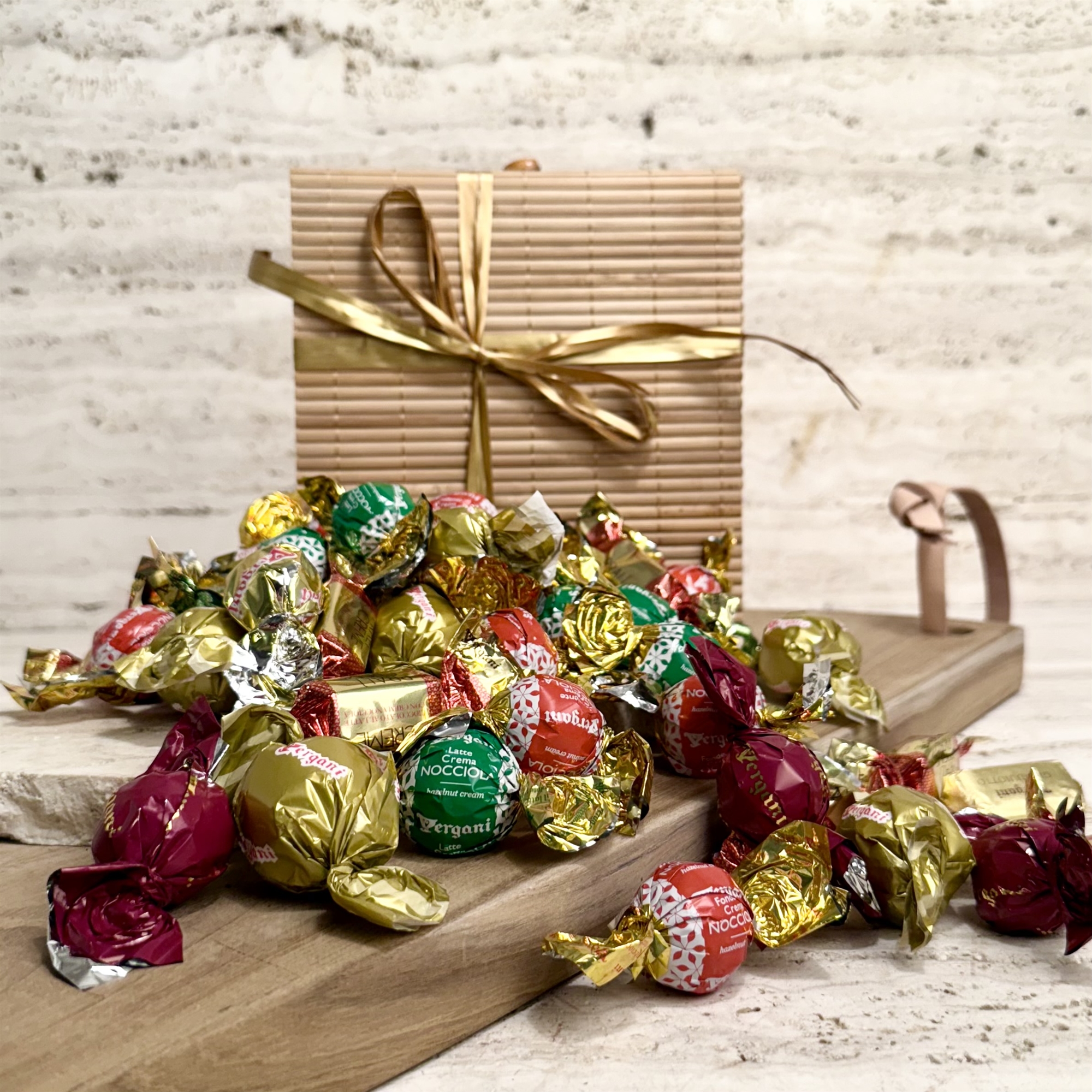 Leder du efter den perfekte firmajulegave til kunder eller medarbejdere? Bambusæske som er en fin gave i sig selv. Her fyldt med 700 gram blandede godter – en luksuriøs blanding af indpakket italiensk chokolade i høj kvalitet. Vi tilbyder gratis kort med jeres hilsen og logo, så gaven er klar til at give videre, Nemmere bliver det ikke.