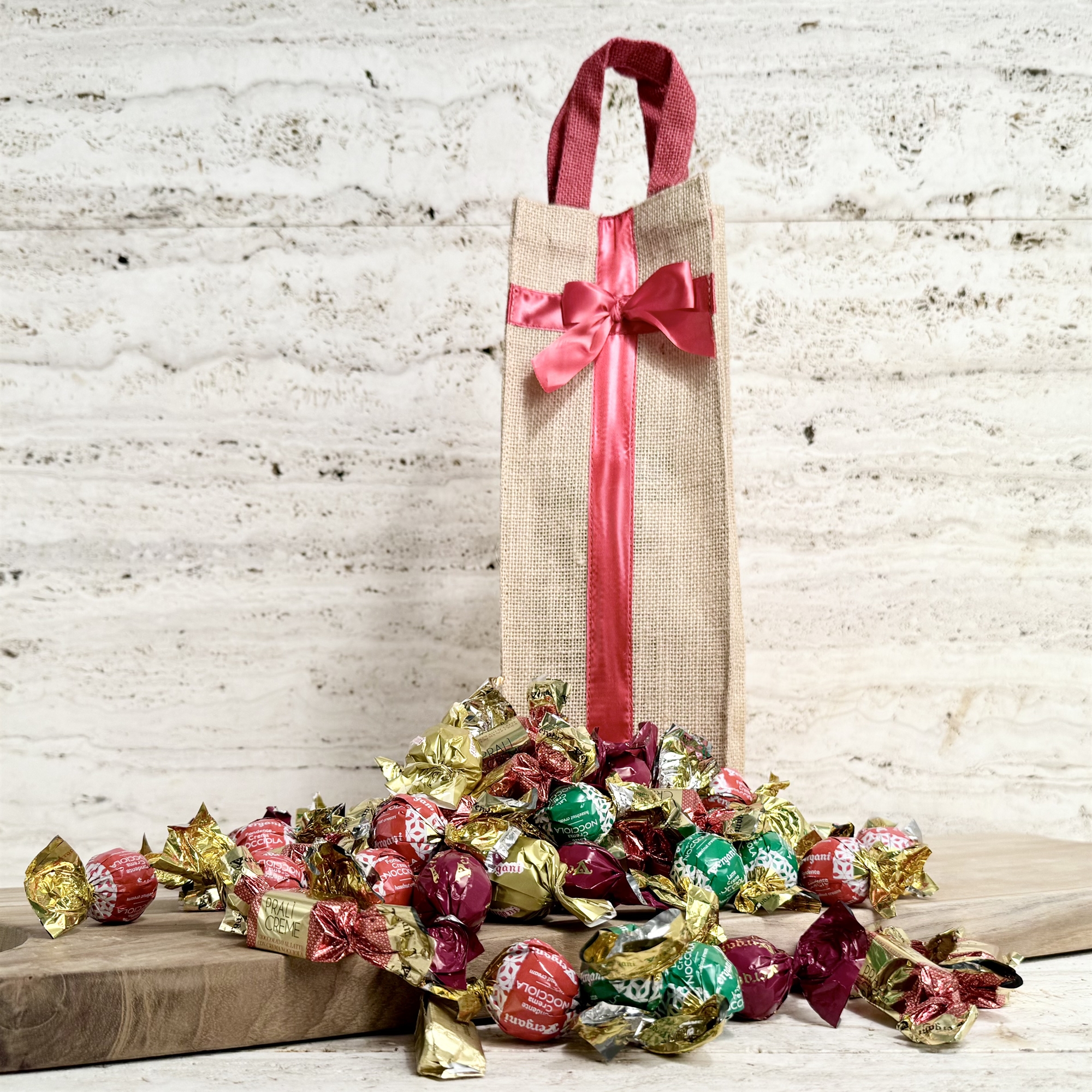 Blandede godter i Juletaske med sløjfe som indeholder 7 varianter indpakkede praliner med hasselnød, jordbærcreme, toffee, karamel, kokoscreme, appelsincreme, flydende karamel med nødder. Jutetasken er et fuldt biologisk nedbrydeligt materiale, en vegetabilsk fiber og 100 % komposterbart. Et bæredygtigt, slidstærkt og miljøvenligt produkt der passer perfekt ind i vores evige jagt på at vores emballager skal være Reduce & Reuse venlige.