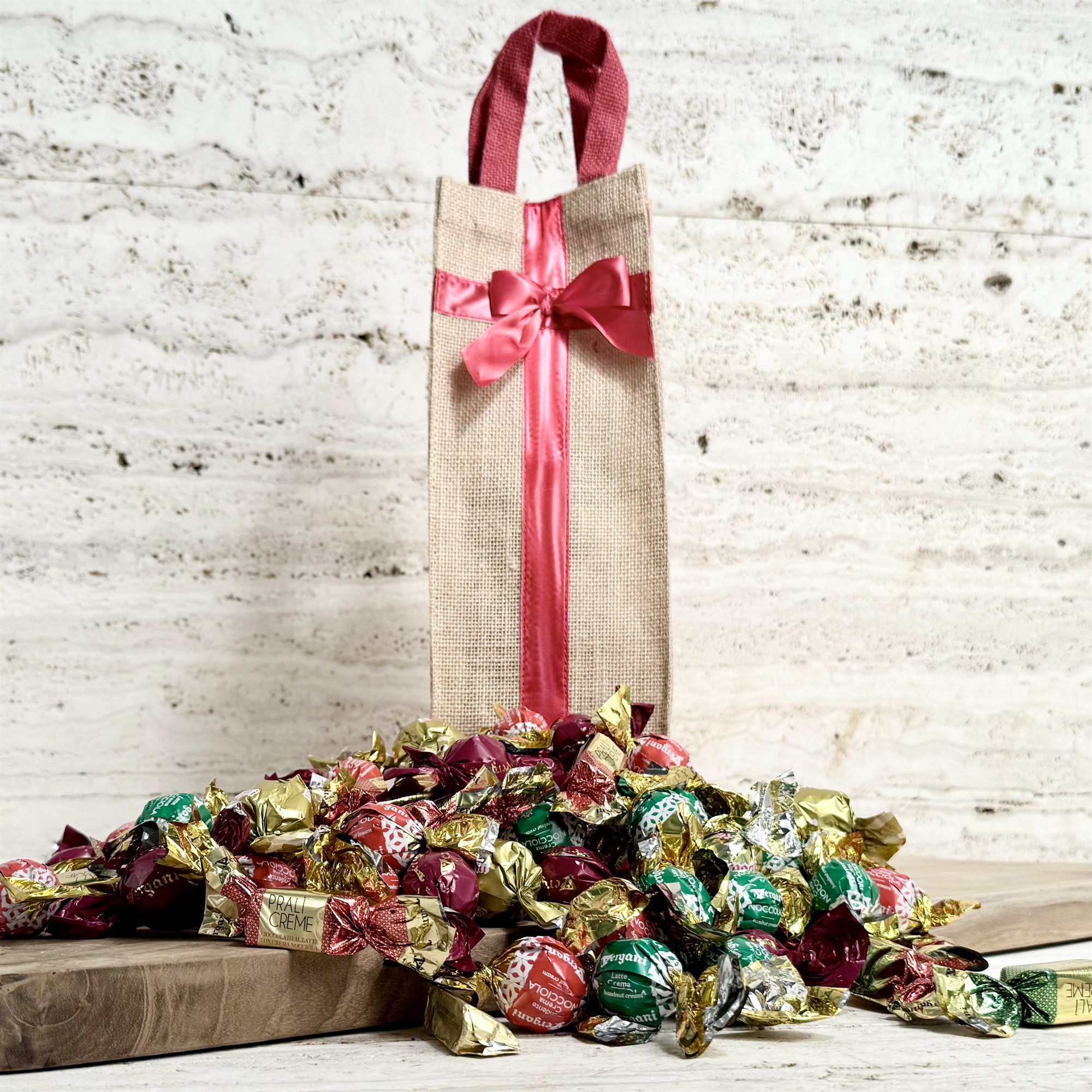 Forkæl kunder, samarbejdspartnere eller medarbejdere med en bæredygtig og velsmagende firmajulegave, der kombinerer kvalitet, design og omtanke. Denne elegante juletaske med sløjfe indeholder ca. 8 varianter af indpakkede italienske praliner, hver med sin egen unikke smagsoplevelse – fra klassisk nougat og mørk chokolade til fyld med nødder, karamel og cremede frugtnoter.