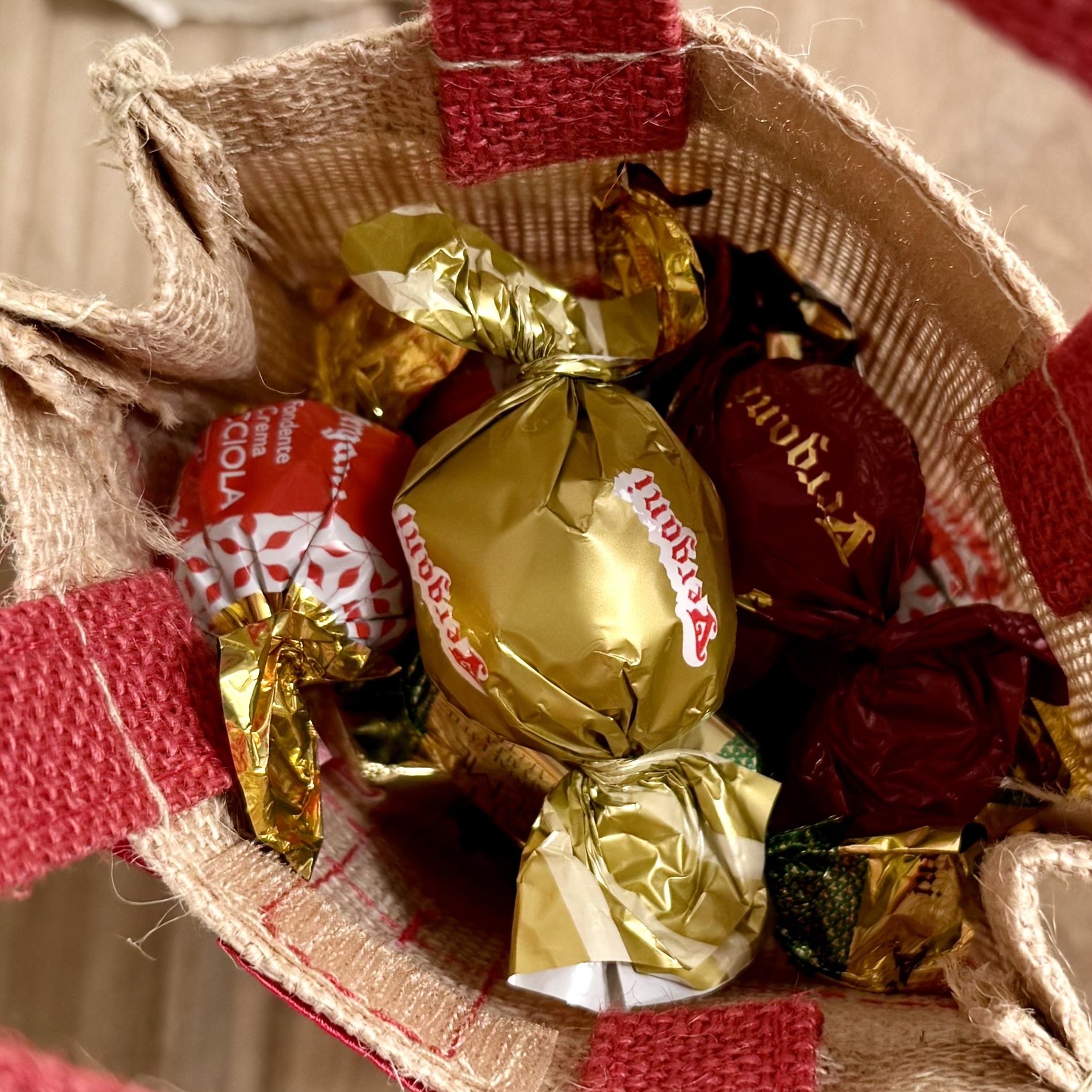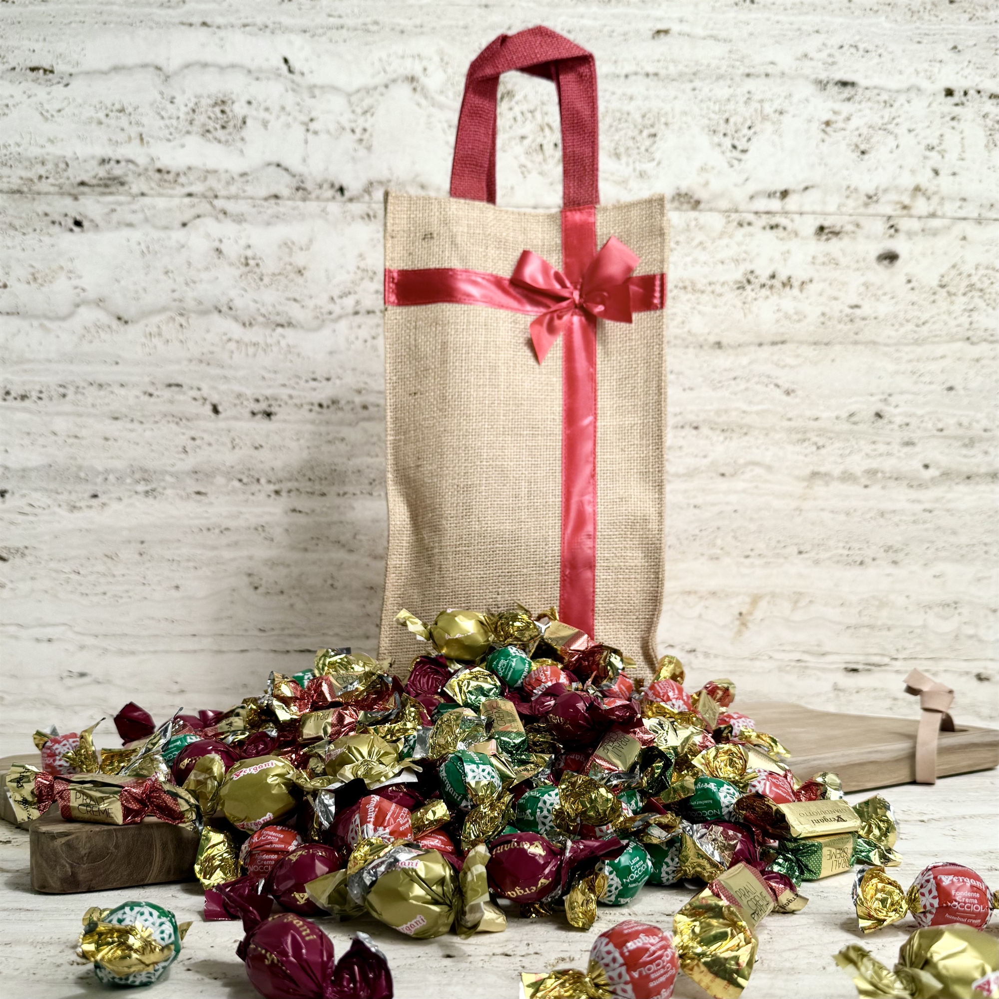 Forkæl kunder, samarbejdspartnere eller medarbejdere med en bæredygtig og velsmagende firmajulegave, der kombinerer kvalitet, design og omtanke. Denne elegante juletaske med sløjfe indeholder ca. 8 varianter af indpakkede italienske praliner, hver med sin egen unikke smagsoplevelse – fra klassisk nougat og mørk chokolade til fyld med nødder, karamel og cremede frugtnoter.