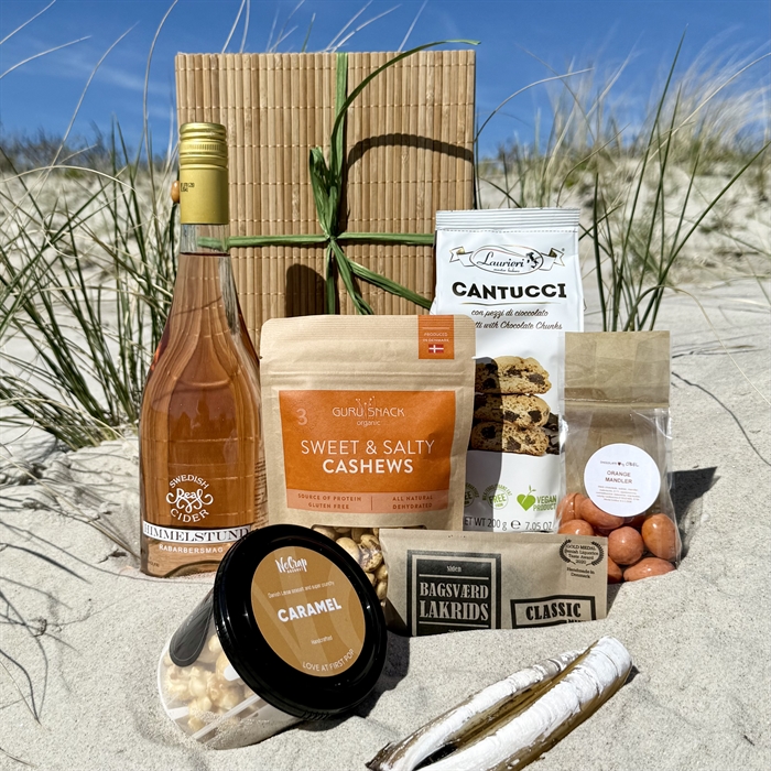Indholdet er nøje udvalgt for at give en varieret og smagfuld oplevelse: En frisk og perlende alkoholfri Himmelstund Rabarber cider (75 cl), økologiske sweet & salty cashewnødder fra Guru Snack (100 g), Italienske cantuccikager med chokoladestykker 200 g, Bagsværd classic lakrids (40 g), chokolademandler med appelsinsmag (90 g) samt popcorn med karamel fra No Crap (65 g). En harmonisk kombination af sødt, salt og friskt, der smager de fleste