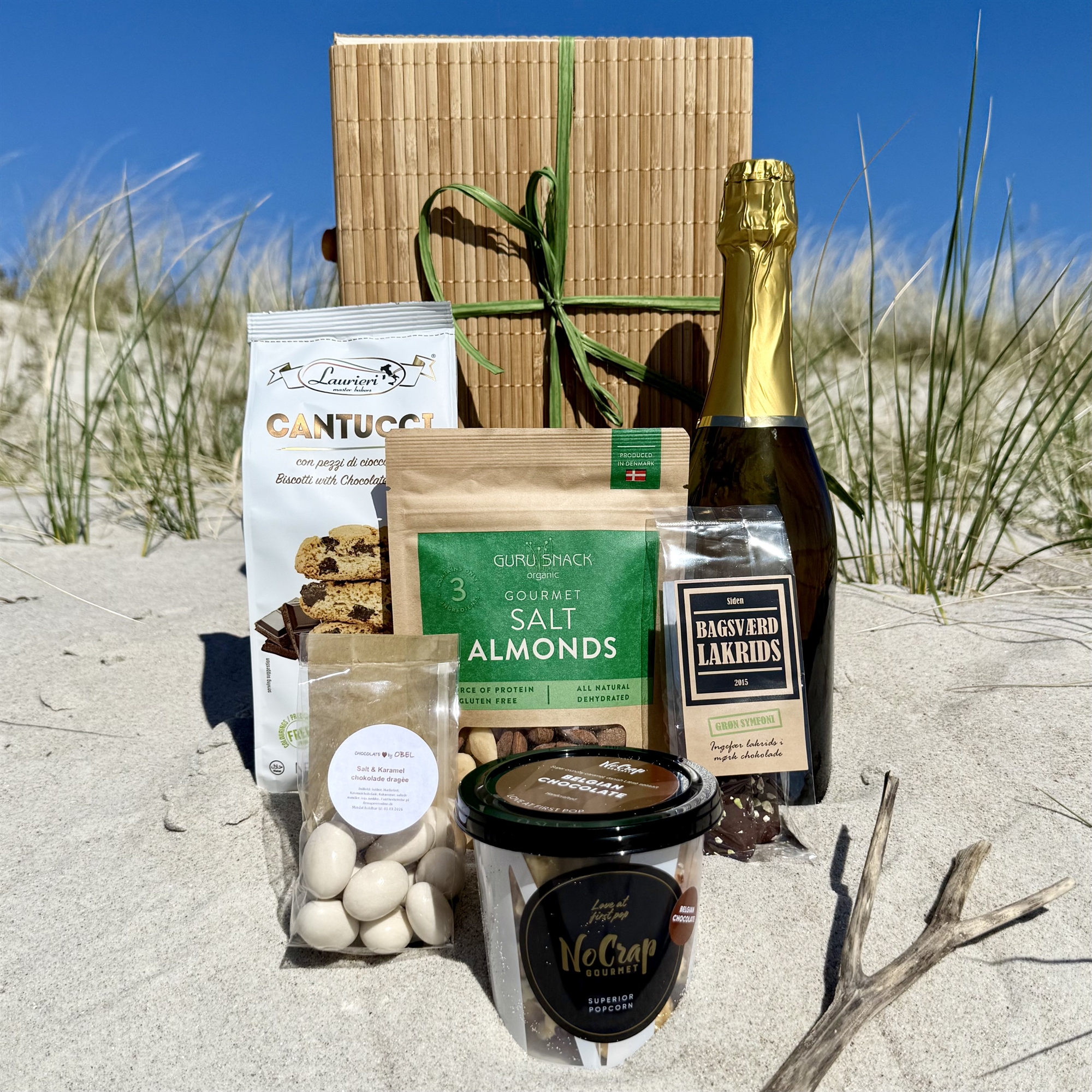 Sommergave i bambusæske med Italienske bobler og masser af lækre snacks