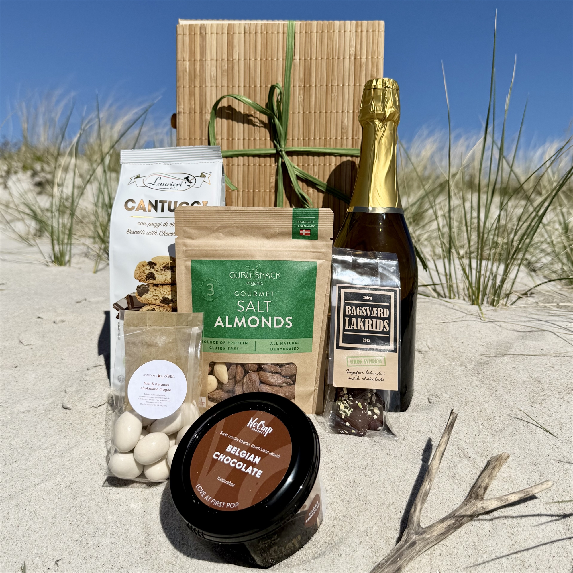 Indholdet er nøje udvalgt for at give en varieret og smagfuld oplevelse: En frisk og sprudlende spumante fra norditalien (75 cl), økologiske saltede mandler fra Guru Snack (100 g), Italienske cantuccikager med chokoladestykker 200 g, Bagsværd lakrids og chokoladestænger (70 g), chokolademandler med saltkaramel (90 g) samt popcorn med belgisk chokolade fra No Crap (65 g). En harmonisk kombination af sødt, salt og friskt, der smager de fleste