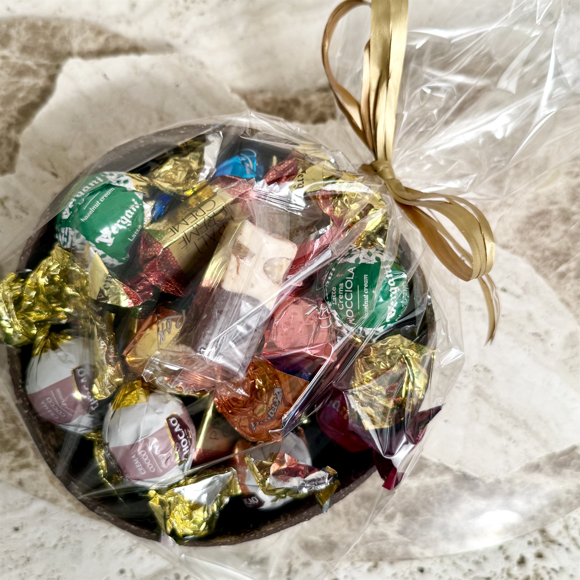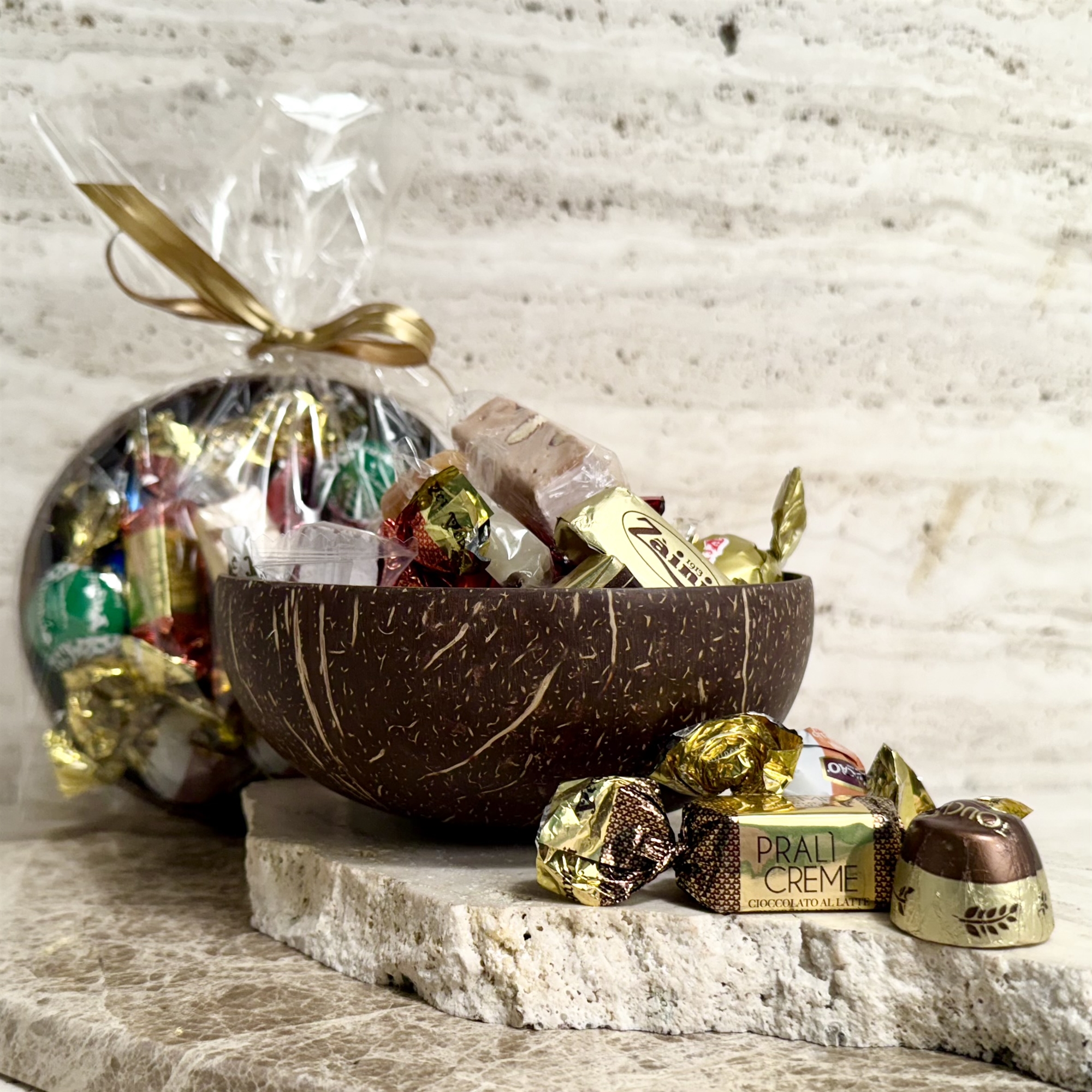Denne kombination af håndværk, bæredygtighed og gourmetchokolade gør kokosnødskålen til en gave, der imponerer og glæder enhver modtager. Den er ideel som: