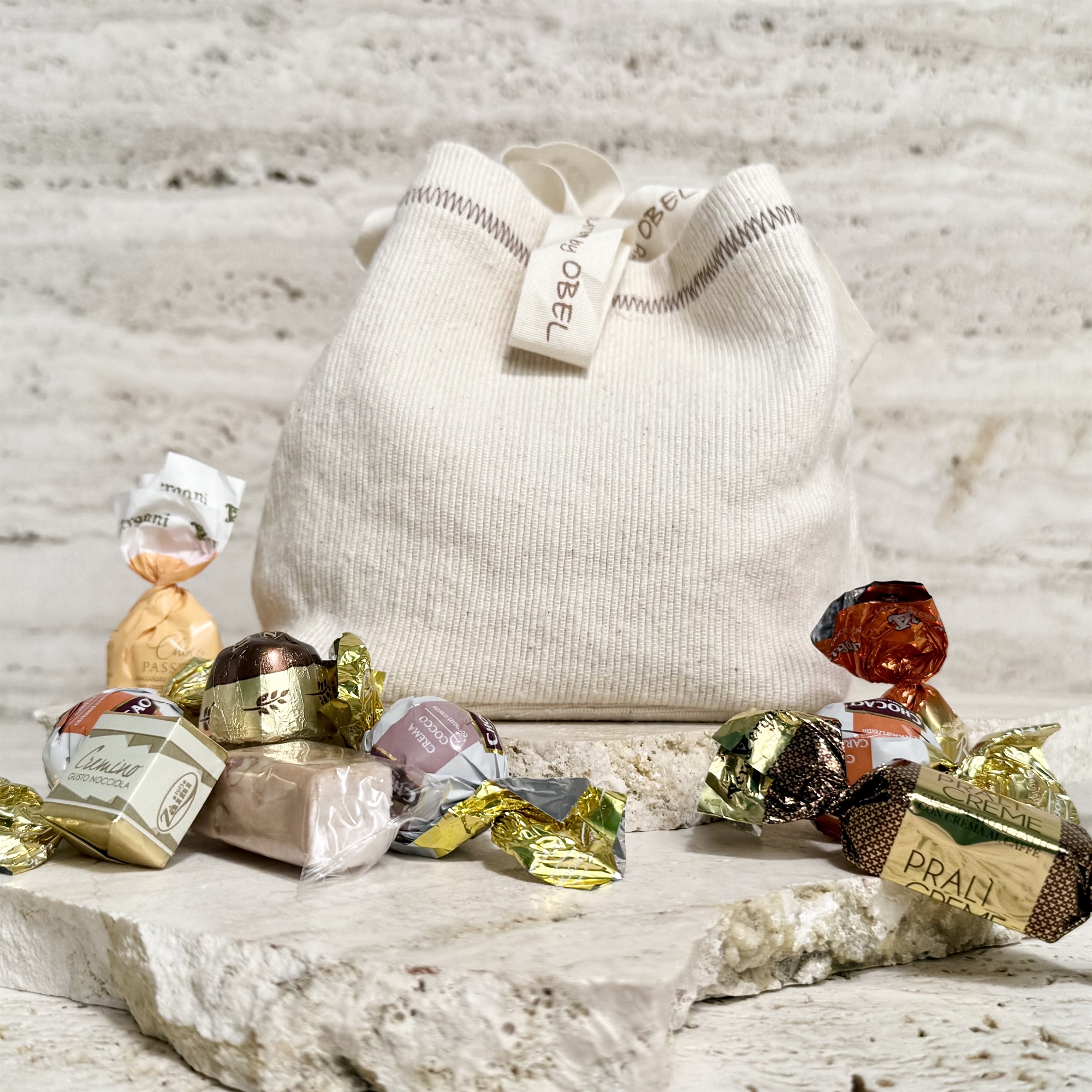 Rustik bomuldspose som er en fin gave i sig selv. Indeholder 600 gram af vores Luksus Chokoladeblanding som er et af vores allerbedste produkter, forfinet gennem mange år for at sikre en udsøgt smagsoplevelse. Blandingen indeholder ca. 25 varianter af chokolade, lakrids og nougat, nøje udvalgt fra vores eksklusive leverandører i Italien, Belgien og DanmarkVi går aldrig på kompromis med kvaliteten og hvert enkelt stykke er håndplukket for sin unikke smag og kvalitet.