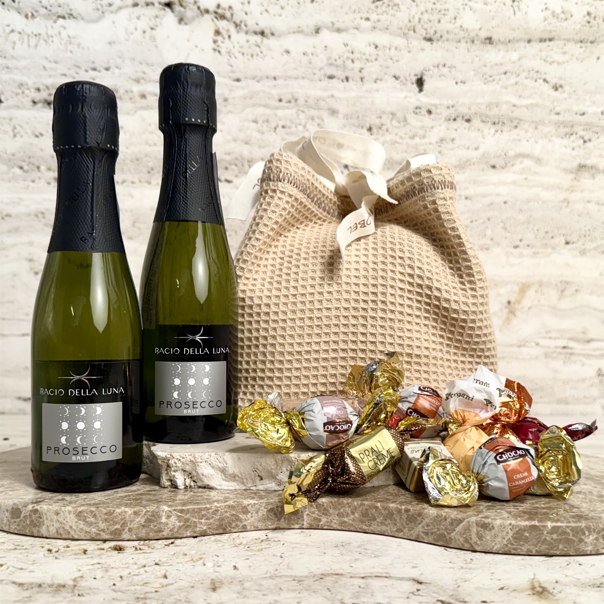 Waffelvævet Bomuldspose med Prosecco og Luksus Chokoladeblanding 500 gram
