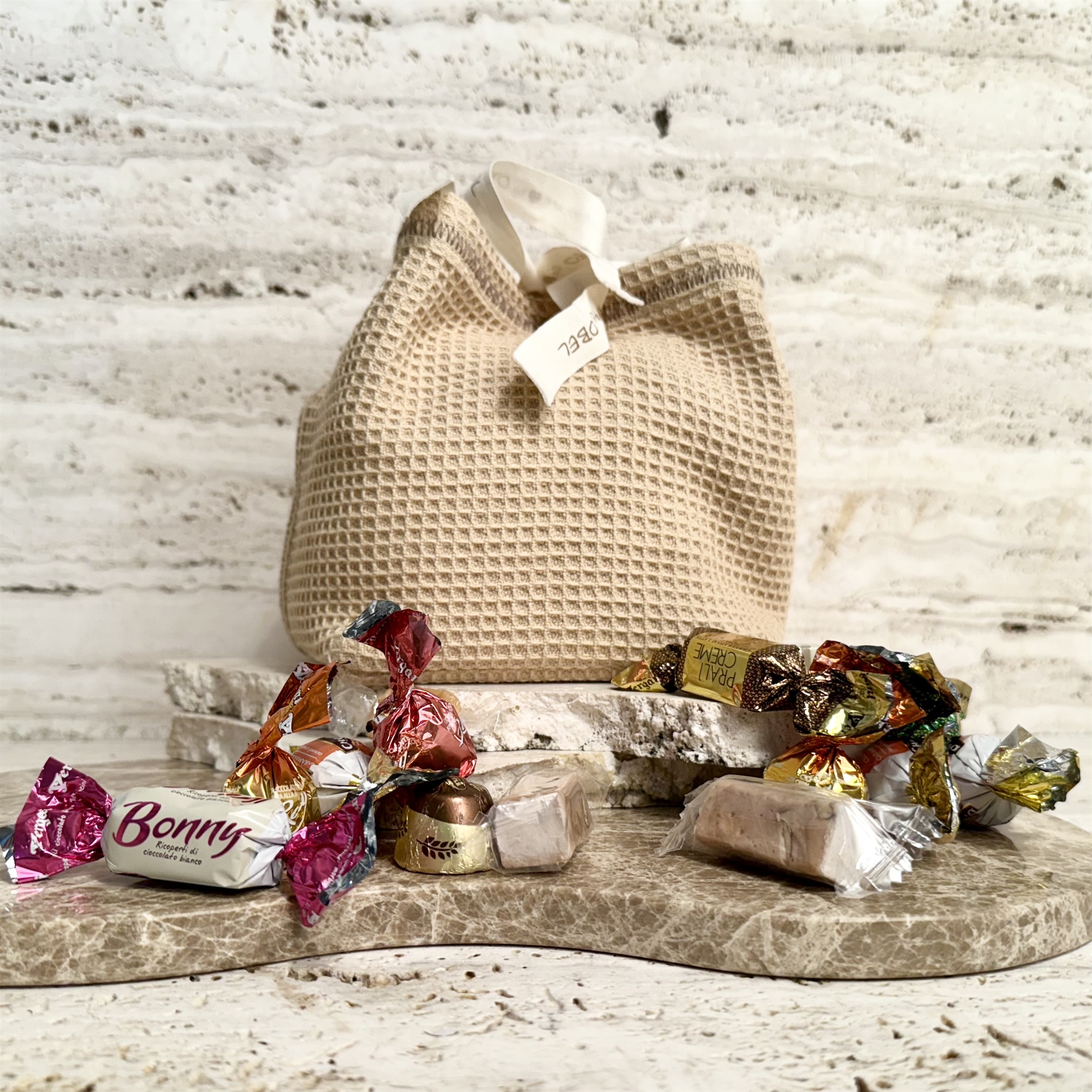 Bomuldspose waffelvævet som er en fin gave i sig selv. Fyldt med 900 gram af vores Luksus Chokoladeblanding som er et af vores allerbedste produkter, forfinet gennem mange år for at sikre en udsøgt smagsoplevelse. Blandingen indeholder ca.25 varianter af chokolade, lakrids og nougat, nøje udvalgt fra vores eksklusive leverandører i Italien, Belgien og DanmarkVi går aldrig på kompromis med kvaliteten og hvert enkelt stykke er håndplukket for sin unikke smag og kvalitet.