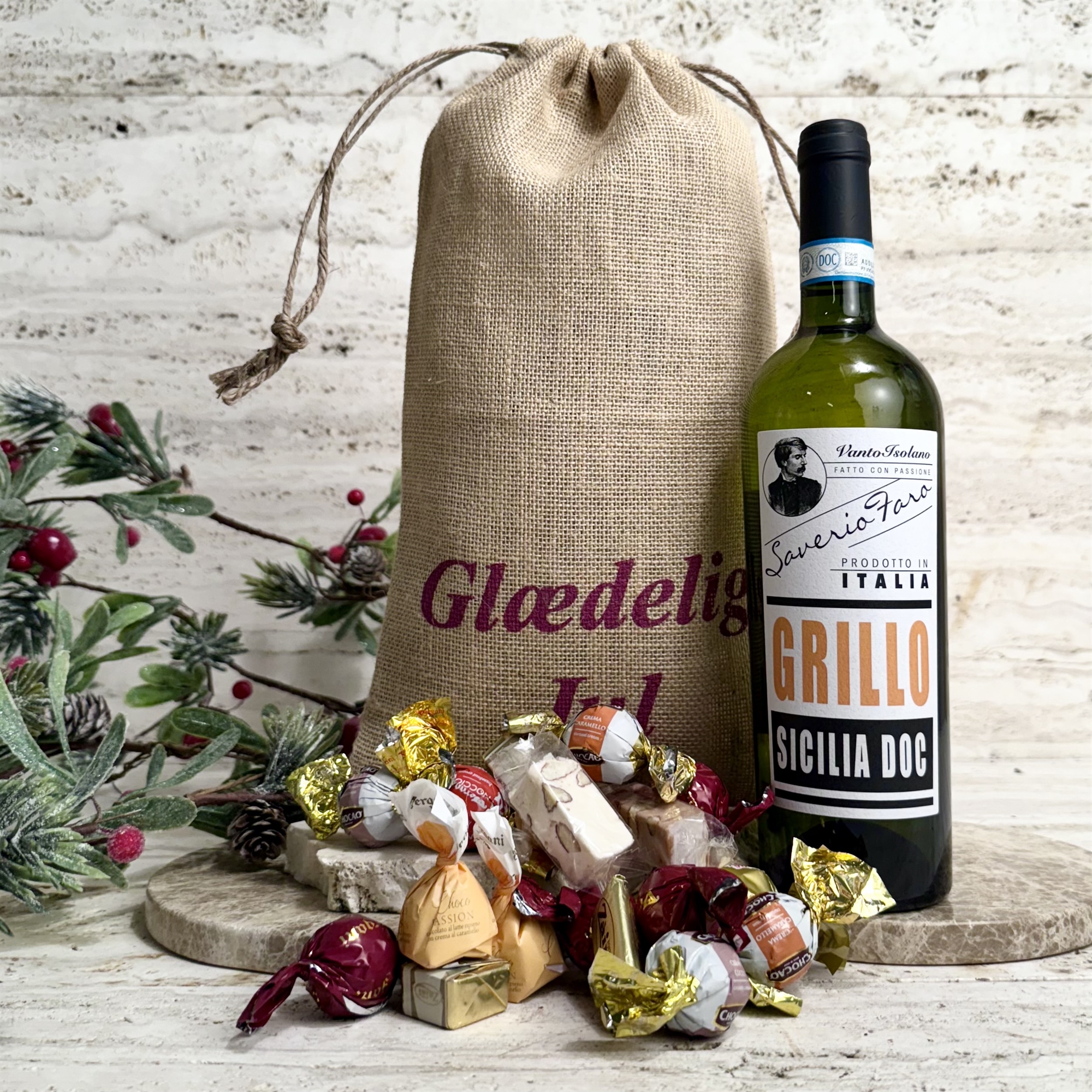Julesæk med 1 flaske Siciliansk hvidvin og 250 gram luksus chokoladeblanding.