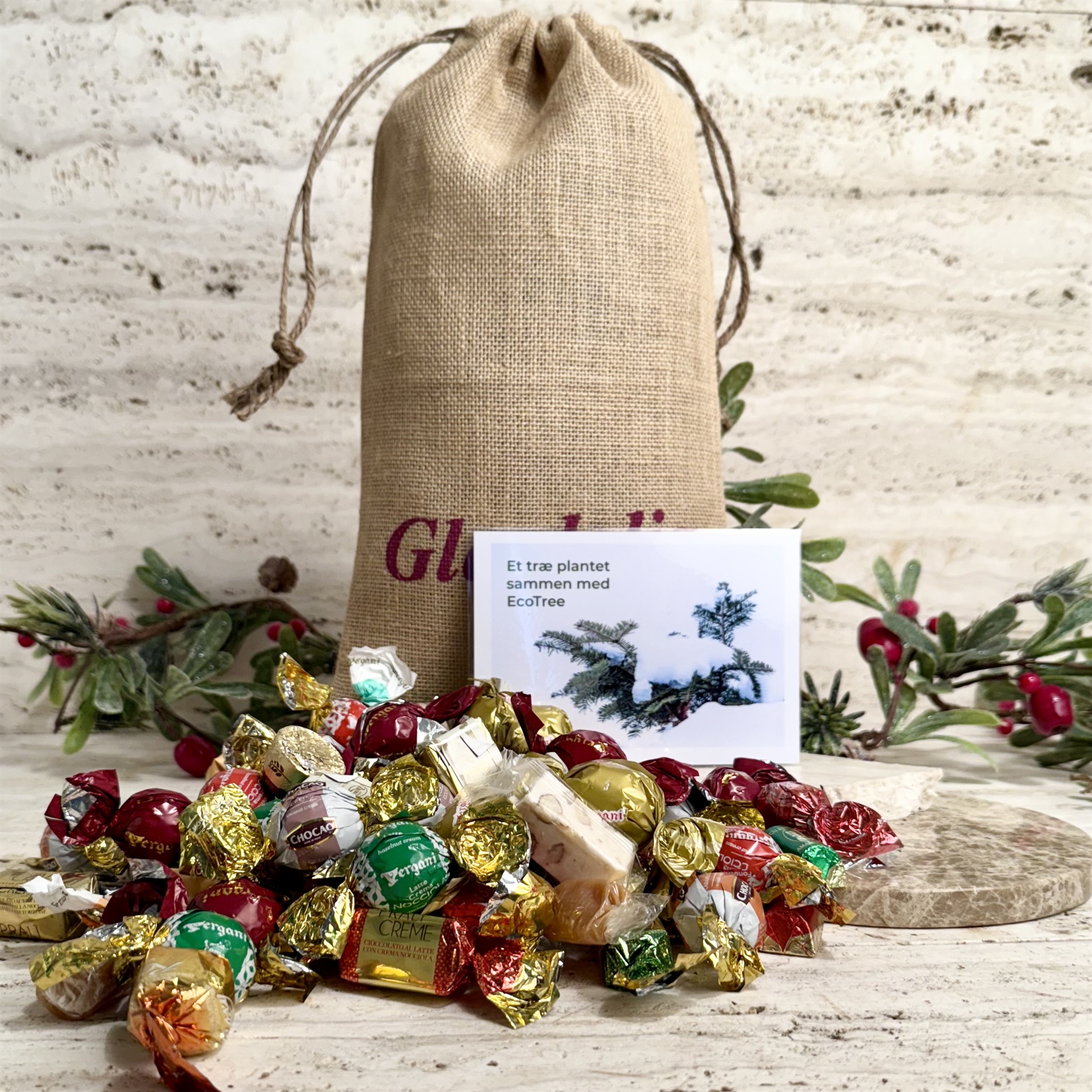 Giv en julegave, der både glæder smagsløgene og gør en forskel for miljøet! Denne Gammeldags julesæk indeholder 1000 gram luksus chokoladeblanding og et Plant et Træ-bevis, så modtageren kan følge sin donation. Chokoladerne er nøje udvalgt fra førende leverandører og spænder fra klassiske favoritter til spændende smagskombinationer.