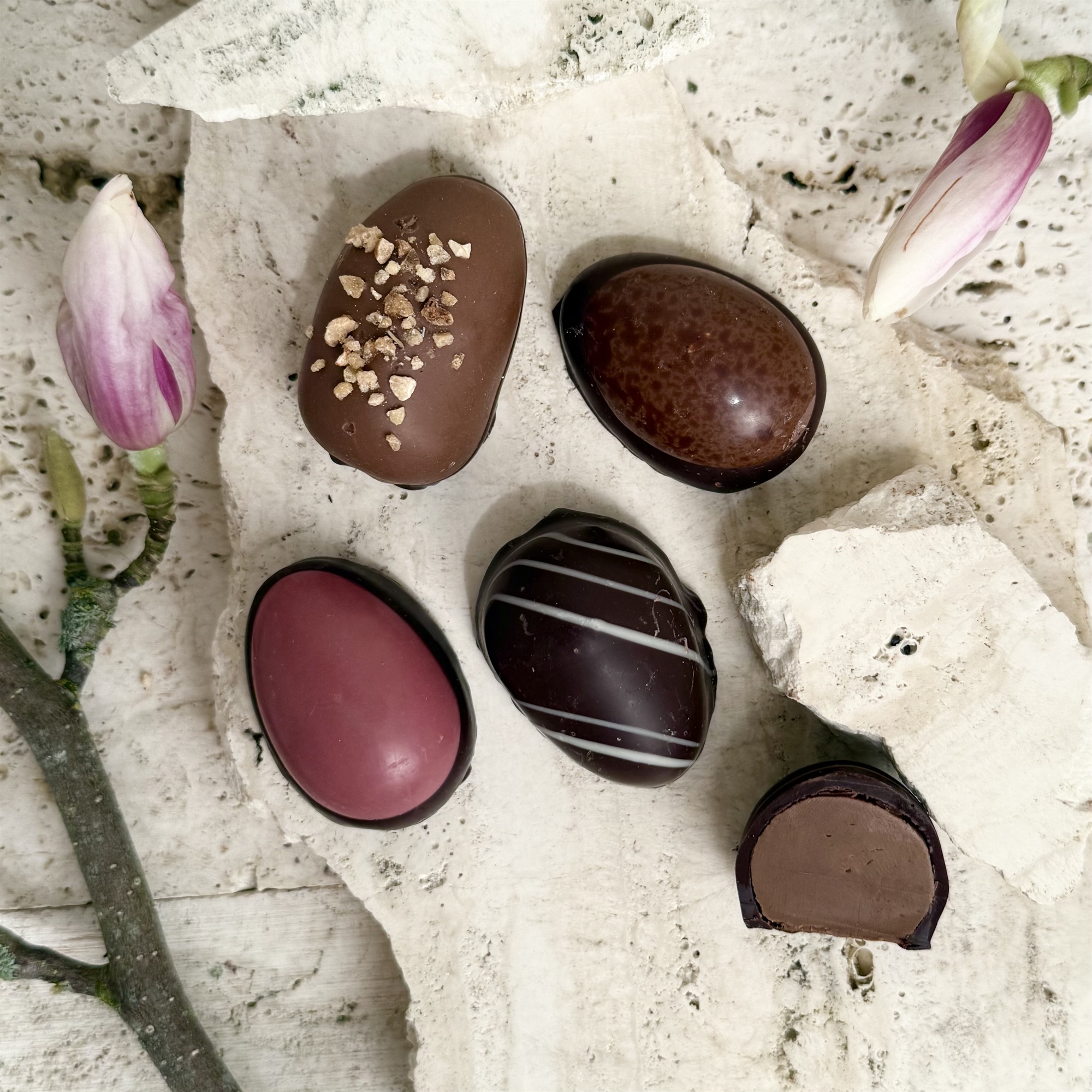• Chokoladeæg med mørk fondant, hvid pistacie og hasselnød