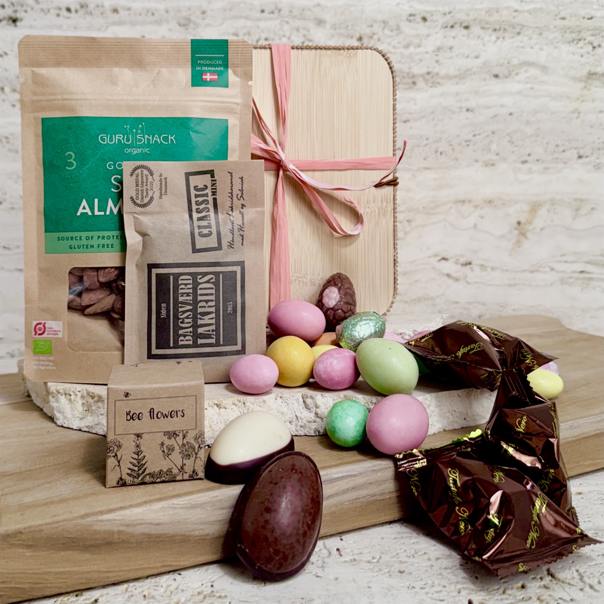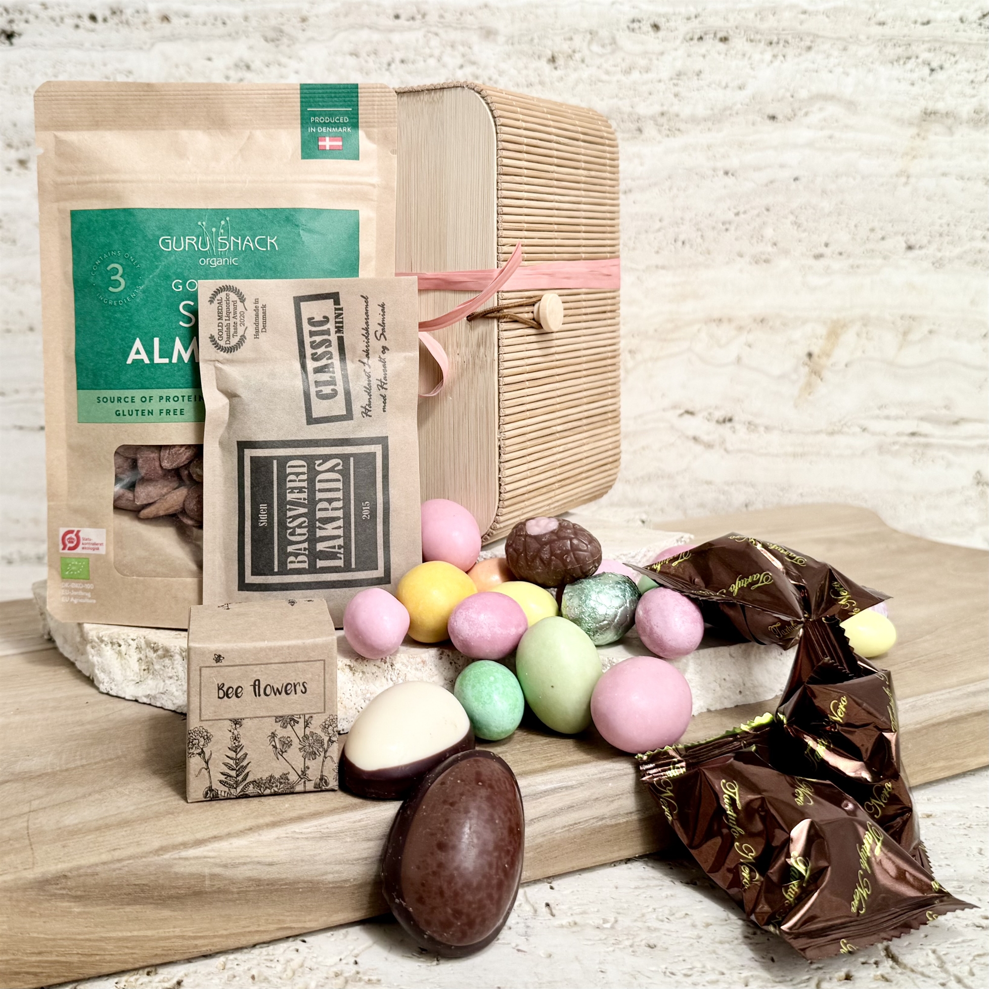 Bambusskrin med Danske påskeæg, Påskeblanding, Bagsværd lakrids, snacks og frøbombe
