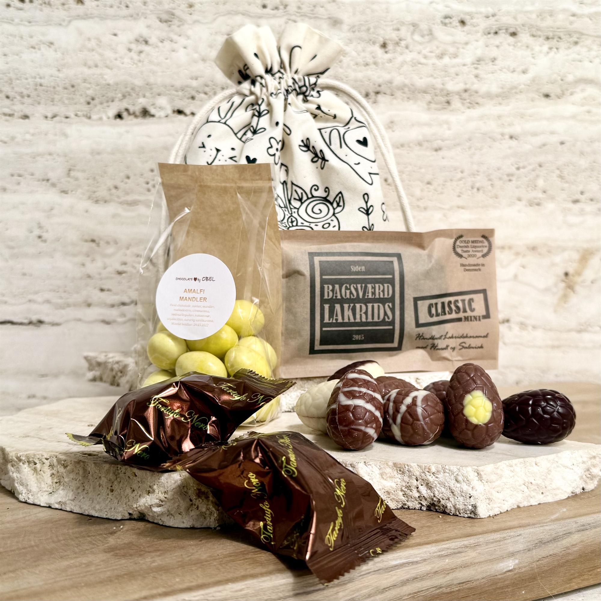 Økopose med påskeprint - Belgiske påskeæg, Amalfimandler, Bagsværd lakrids og chokoladetrøfler