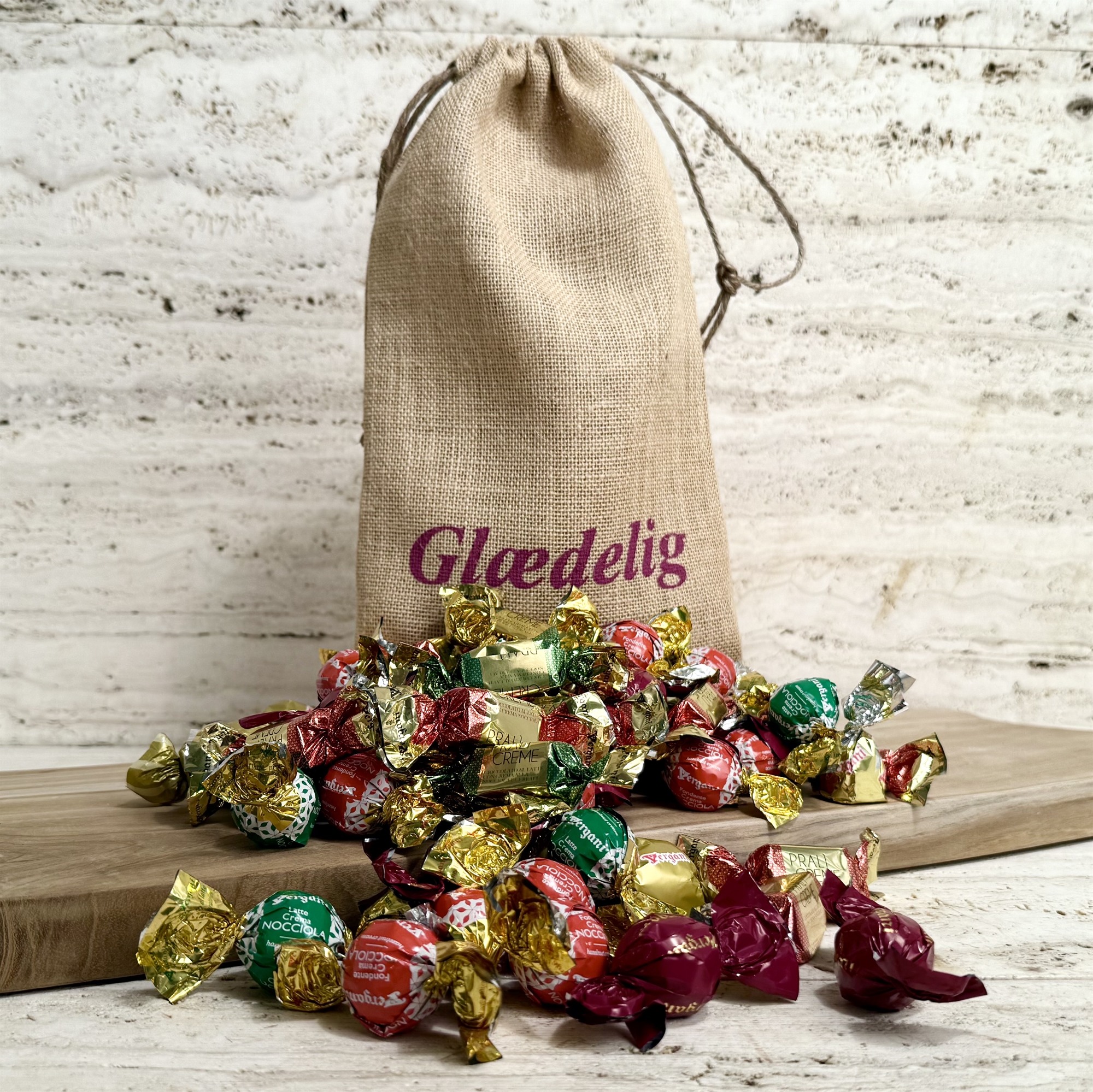Leder du efter den perfekte firmajulegave til kunder eller medarbejdere? Vores julesæk med "Glædelig Jul" er det ideelle valg, når du vil sprede julestemning med stil og smag. Den dekorative julesæk er fyldt med 1,2 kilo blandede godter – en luksuriøs blanding af indpakket italiensk chokolade i høj kvalitet.