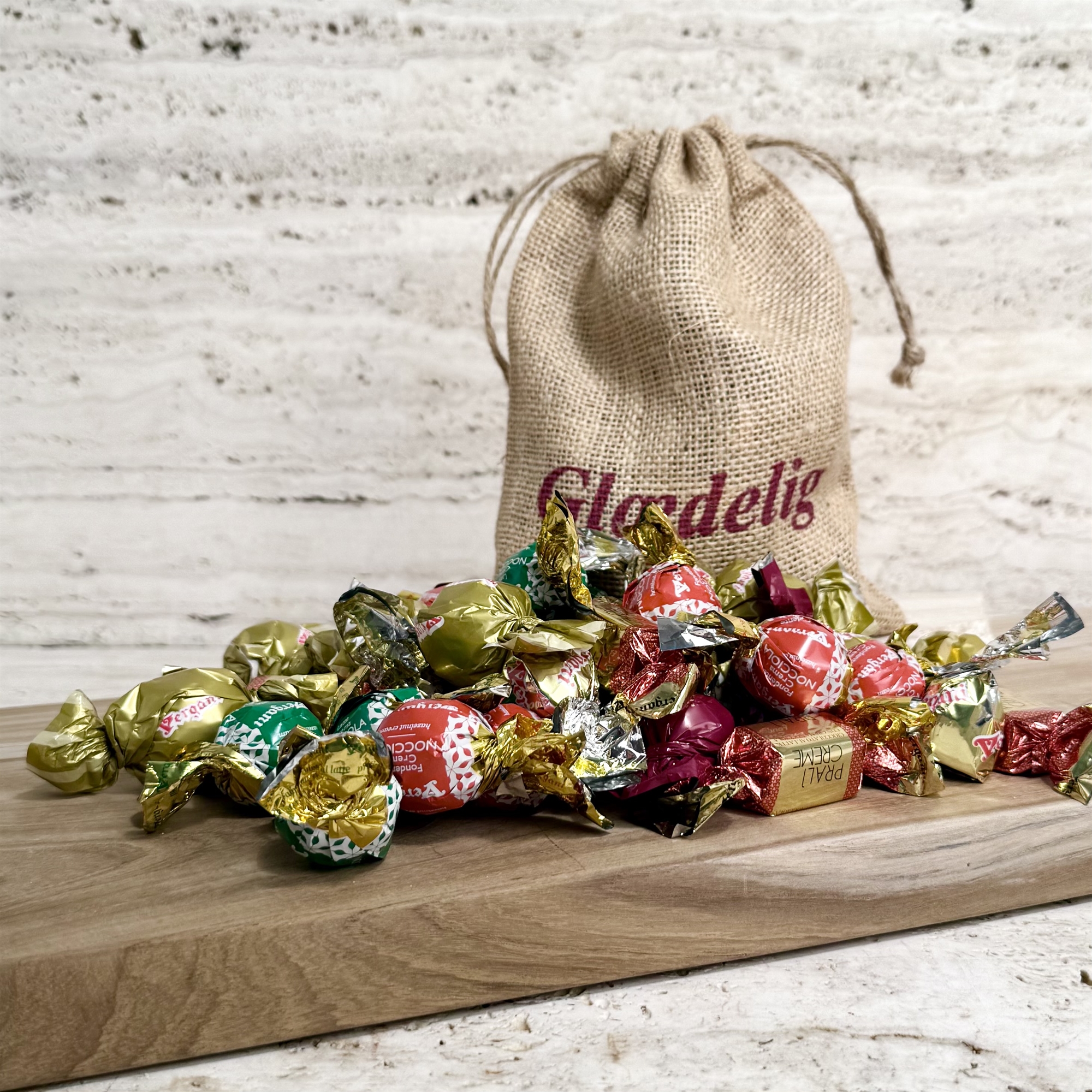 Leder du efter den perfekte firmajulegave til kunder eller medarbejdere? Vores julesæk med "Glædelig Jul" er det ideelle valg, når du vil sprede julestemning med stil og smag. Den dekorative julesæk er fyldt med 400 gram blandede godter – en luksuriøs blanding af indpakket italiensk chokolade i høj kvalitet.