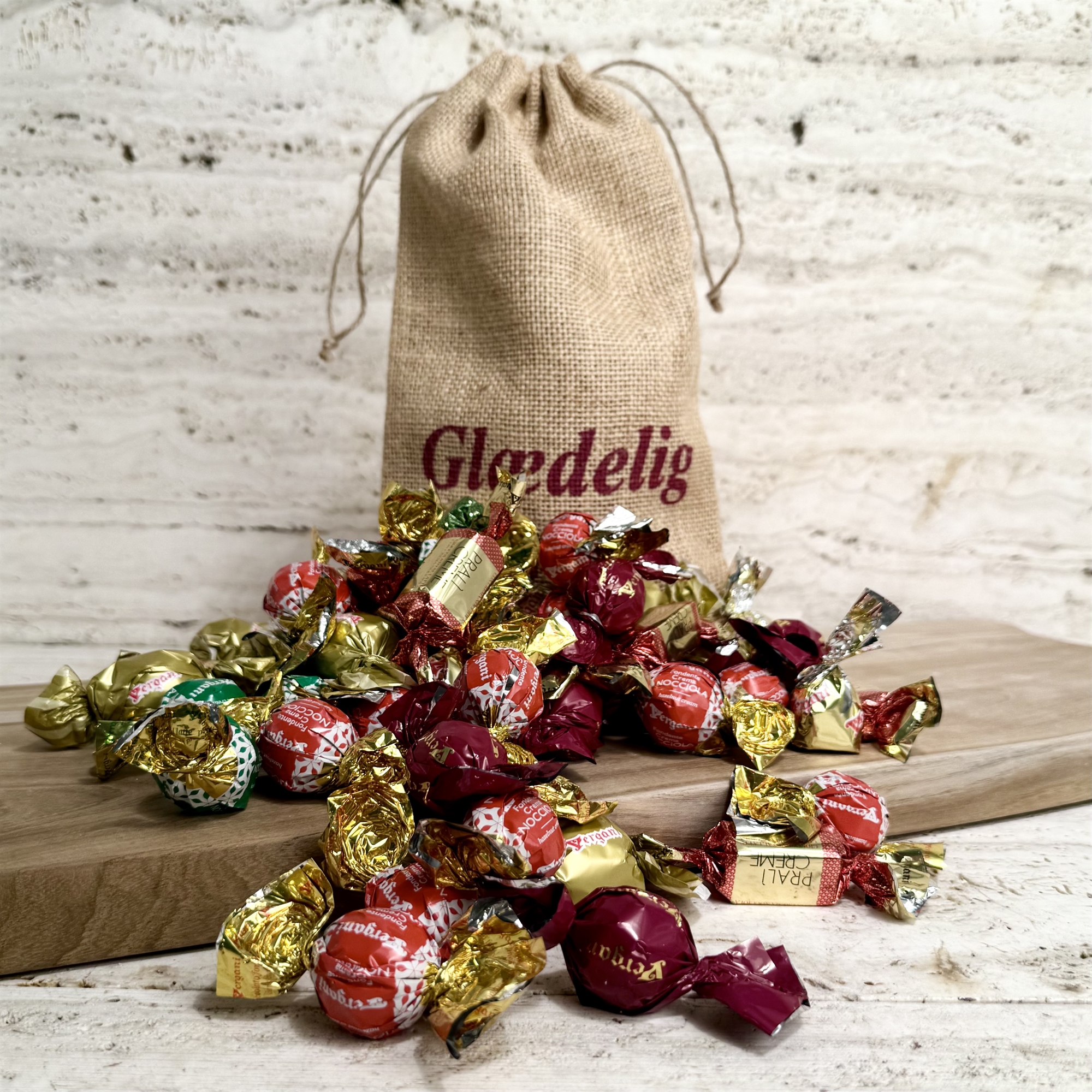 Leder du efter den perfekte firmajulegave til kunder eller medarbejdere? Vores julesæk med "Glædelig Jul" er det ideelle valg, når du vil sprede julestemning med stil og smag. Den dekorative julesæk er fyldt med 900 gram blandede godter – en luksuriøs blanding af indpakket italiensk chokolade i høj kvalitet.