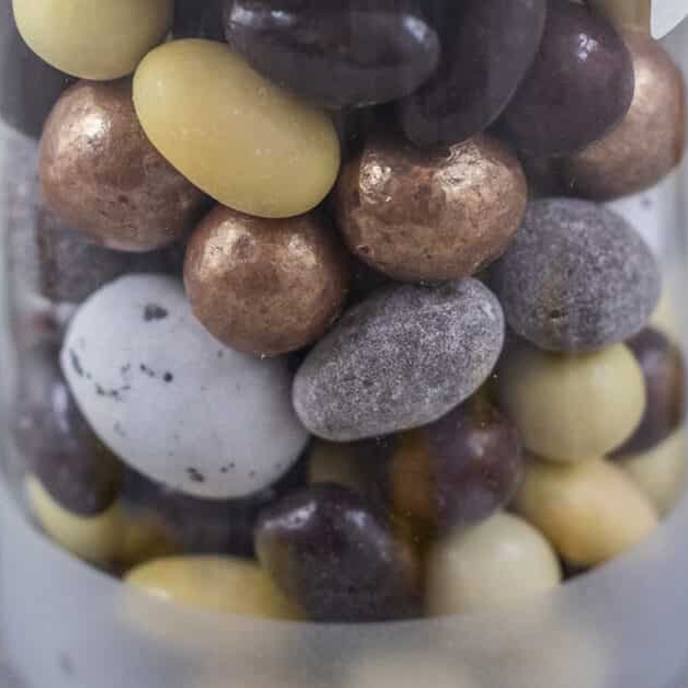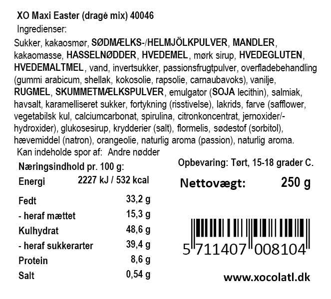 XO MAXI EASTER Elegant glas med trælåg fyldt med lækkerier som nougatæg, mandler med chokolade og passionsfrugt, sprøde crispy snack, nougatmandler, saltede lakridser med karamelchokolade mm. Ca. 250 gr.