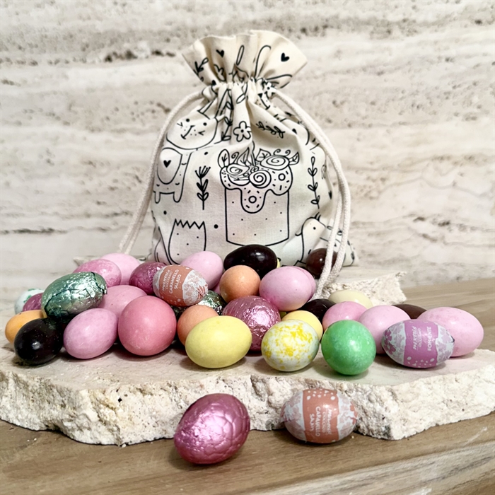 Økologisk GOTS certificeret bomuldspose med fint påskeprint fyldt med 400 gram af vores Luksus Påskeblanding som er et af vores allerbedste produkter, forfinet gennem mange år for at sikre en udsøgt smagsoplevelse. Blandingen indeholder ca.15 varianter af chokoladepåskeæg, nøje udvalgt fra vores eksklusive leverandører i Italien, Belgien og Danmark. Vi går aldrig på kompromis med kvaliteten og hvert enkelt påskeæg er håndplukket for sin unikke smag og kvalitet.