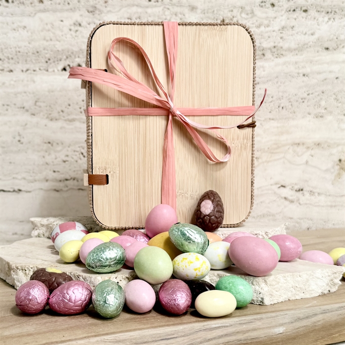 Denne smukke bambusæske en gave i sig selv. Fyldt med 1000 gram af vores Luksus Påskeblanding som er et af vores allerbedste produkter, forfinet gennem mange år for at sikre en udsøgt smagsoplevelse.