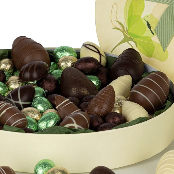 Et dejligt mix af påskeæg med flere slags overtrækschokolade og flere smage. Leveret i smuk hatteæske – en uimodståelig smagsoplevelse. Perfekt til medarbejdernes påskegave.