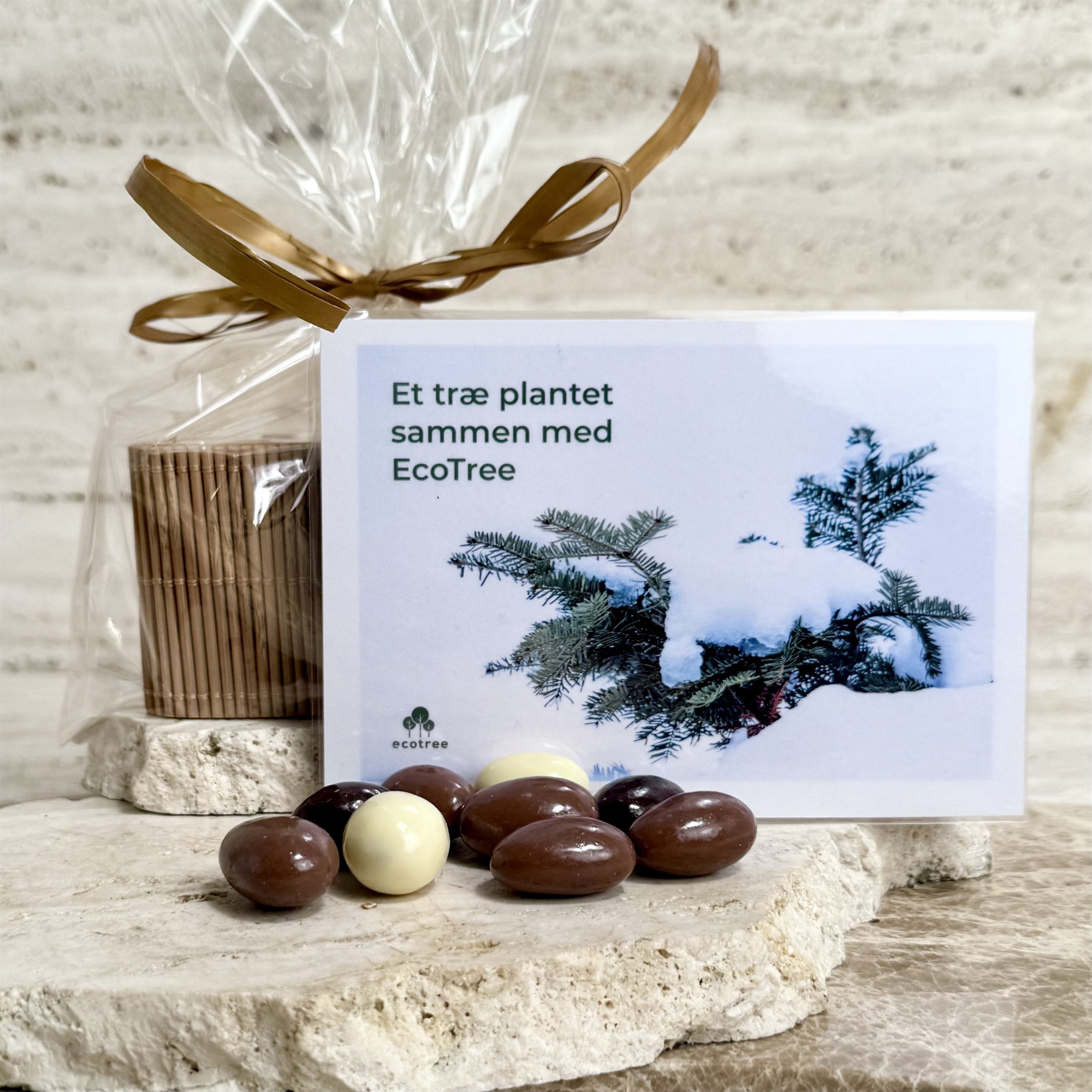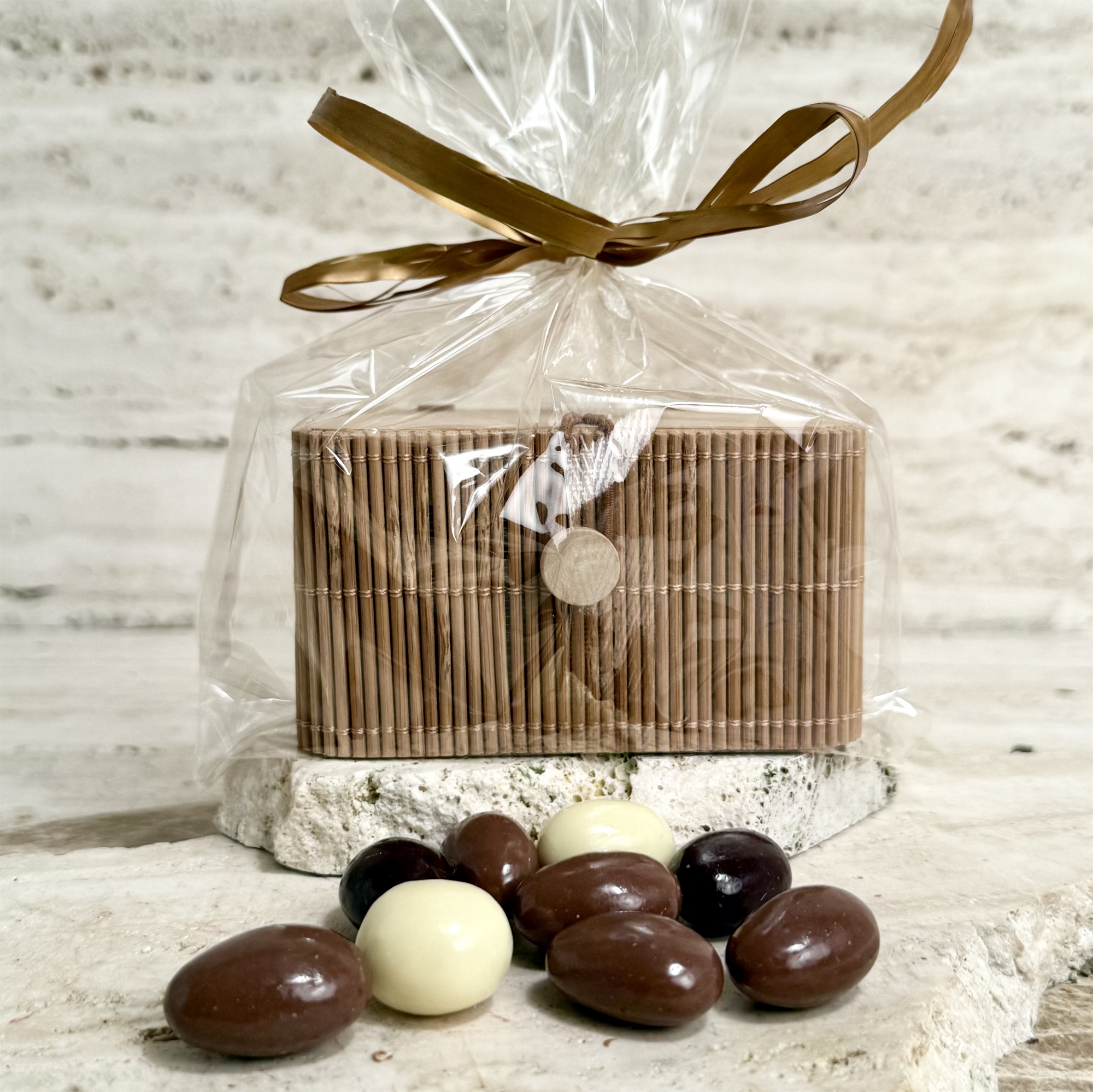 Plant et træ bevis (donationstræ - læs mere her KLIK HER) Bambusæske med låg er en gave i sig selv. Fyldt med 200 gram af vores egne italienske chokolademandler. Virkelig en smuk og og velsmagende gave der vil vække glæde ved modtager.