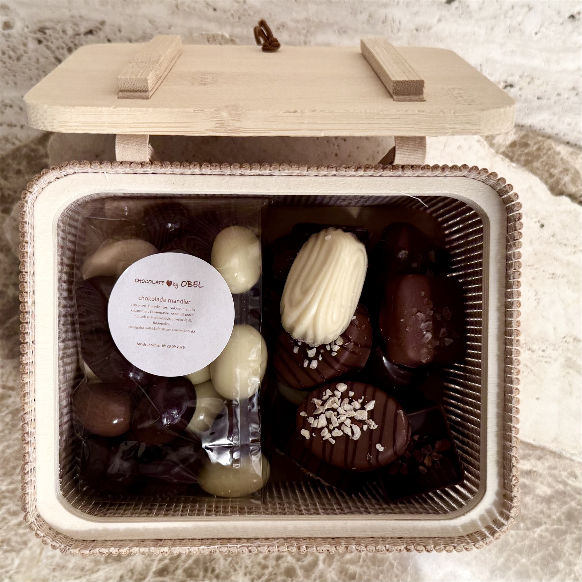 Plant et træ bevis (donationstræ - læs mere her KLIK HER) Bambusæske med låg er en gave i sig selv. Fyldt med 200 gram italienske chokolademandler og 12 stk. Belgisk gourmet dessertchokolade . Skøn og velsmagende gave.